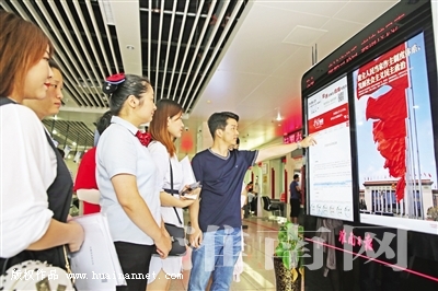 當(dāng)日上午,在市政務(wù)服務(wù)大廳,前來辦理事務(wù)的市民王先生,意外發(fā)現(xiàn)大廳里多了一臺外觀新穎的大型電子閱報屏。“通過手指觸屏、滑動,我翻閱了當(dāng)天的淮南日報、淮河早報,瀏覽了淮南網(wǎng),點擊了‘學(xué)習(xí)強國’,還觀看了展示淮南旅游風(fēng)光、美好形象、厚重歷史以及經(jīng)濟(jì)社會民生環(huán)境發(fā)展的短視頻?煽、可聽、可讀,圖、文并茂,聲、音并重,多維呈現(xiàn)。我很喜歡這種閱讀形式!”王先生告訴記者。