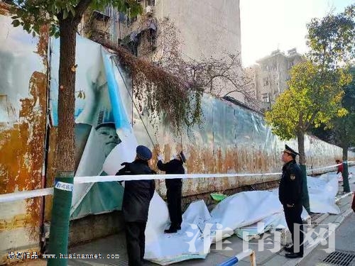 1月8日上午,寒風(fēng)凜冽,淮河早報(bào)、淮南網(wǎng)記者趕到廣場(chǎng)北路時(shí),田區(qū)城管行政執(zhí)法局已在廣告牌旁的人行道上拉起了警戒線,兩名執(zhí)法隊(duì)員正在清理廣告牌上的背景幕布,其他執(zhí)法隊(duì)員則帶著專業(yè)工人正在現(xiàn)場(chǎng)拆除鋼構(gòu)框架。淮河早報(bào)、淮南網(wǎng)記者看到,這處大型戶外廣告牌被固定在人行道旁的圍墻上,多處被固定的鐵皮已出現(xiàn)了松散和破損,寒風(fēng)一吹,鐵皮嘩嘩作響且向外翹起,非常容易刮傷路人,而鐵皮后的鋼架更是銹蝕嚴(yán)重。“這處廣告牌已經(jīng)存在10多年了,之前外面蒙著廣告幕布還不覺得什么,可這兩年每次從這經(jīng)過都只能看到光禿禿的鐵皮和破損的鋼架,既不安全也不美觀,現(xiàn)在將其拆掉真是太好了!”現(xiàn)場(chǎng)采訪中,路過的市民對(duì)于這處“隱患”廣告牌被拆除拍手叫好。