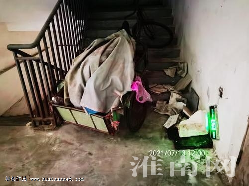 在菜市場東邊有兩個(gè)樓梯通道。其中一個(gè)在靠近公共衛(wèi)生間的樓梯通道上,樓梯間停放著一輛紅色的三輪車,將通道占去一半,而三輪車后面裝滿了物品。而該樓梯口一扇長滿霉斑的防火木門上還張貼著一張紙,上面寫著“消防通道內(nèi)禁止大小便,違者處罰!”另一個(gè)在靠近電梯的樓梯通道上,樓梯內(nèi)比較黑暗,沒有照明,且通道被一輛三輪自行車安全占據(jù)。三輪車上堆滿物品,旁邊還堆放著泡面盒等雜物。安全出口的指示燈也已脫落,貼著墻面懸吊著。