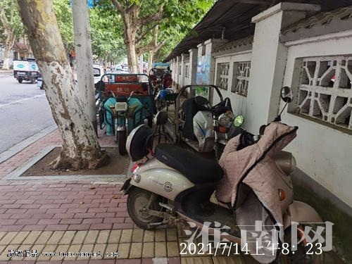 當(dāng)天上午8時(shí)許,淮河早報(bào)、淮南網(wǎng)記者來到田東菜市場南門,遠(yuǎn)遠(yuǎn)就看到環(huán)衛(wèi)工人在道路兩邊清掃衛(wèi)生,有的環(huán)衛(wèi)工人還在用抹布擦洗垃圾桶。順著菜市場外墻的人行道由南往北走,可以看到經(jīng)過清掃,整個(gè)人行道還是很干凈的。走到人行道中段,幾輛三輪車、電動(dòng)車沒有按照地面施劃要求停放,橫七豎八地?fù)踝×巳ヂ贰?