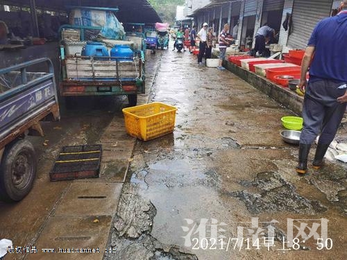 田東菜市場的水產(chǎn)活禽區(qū)和蔬菜區(qū)的環(huán)境比起來那就差遠(yuǎn)了,水產(chǎn)區(qū)每家經(jīng)營戶門口都有臺面,盛裝水產(chǎn)的盆大多數(shù)是放在臺面上,偶有放在臺面外的,可這并不是最主要的,這里臟亂差的原因是臺面和下水道離得很遠(yuǎn),市民來選購水產(chǎn)正好站在水產(chǎn)品和下水道之間的過道,所以只要來買魚蝦,一定會(huì)腳上帶水。而且因?yàn)殚L期潮濕,這一片地面已經(jīng)有不同程度的破損,到處坑坑洼洼,還有的地方長有青苔,稍不留神,崴腳或滑倒都有可能。