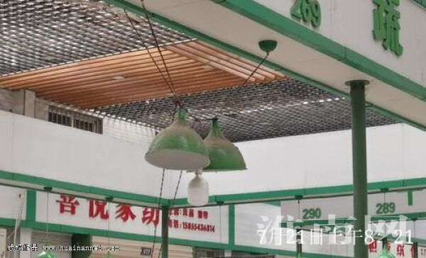 淮河農(nóng)貿(mào)市場每個攤位上方都標(biāo)有攤位號并懸掛著一盞綠色或紅色燈罩的照明燈,遠(yuǎn)遠(yuǎn)看著整整齊齊?勺呓螅屓嗽尞惖氖,這些燈大多數(shù)是擺設(shè),并沒有使用,而且燈罩上、電線上都蒙著厚厚的灰塵,仔細(xì)一看,燈罩里面并沒有燈泡。有一些攤主把兩個照明燈纏在一起充當(dāng)支架,自己接了一個燈懸掛在上面。尤其是在賣肉的攤位前,淮河早報、淮南網(wǎng)記者看到這里的電線很多,除了照明,還有絞肉機需要用電,好幾條電線纏繞在一起。