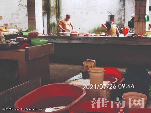 7月26日上午,天氣時(shí)陰時(shí)晴,雖然最高溫度在30度左右,但感覺不是很熱。上午9時(shí)43分,淮河早報(bào)、淮南網(wǎng)記者在土壩孜菜市場(chǎng)內(nèi)看到,市場(chǎng)內(nèi)人員往來(lái)不斷,在一肉攤處,有一光頭男子袒胸露腹,光著上半身在剁肉。大約半個(gè)多小時(shí),一直到淮河早報(bào)、淮南網(wǎng)記者離開菜市場(chǎng),該男子仍光著上半身。
