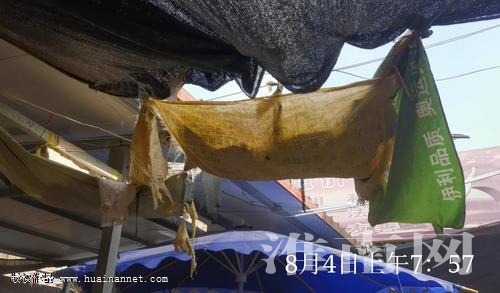 臨時市場頭頂是黑色的網(wǎng)狀遮陽篷,這些遮陽篷不少地方已經(jīng)破損,有的破損處被人用其它顏色、質(zhì)地的篷子遮了一下,有的地方則沒有遮蓋,成條狀的遮陽篷隨風(fēng)飛舞。
