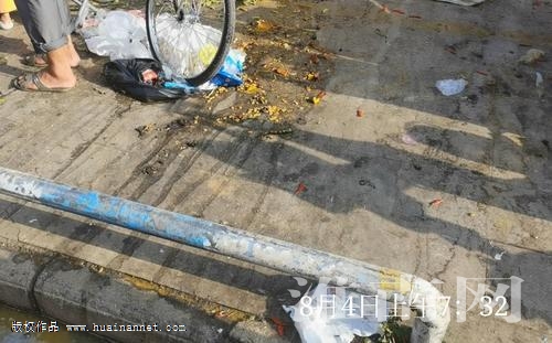 8時25分,當(dāng)淮河早報、淮南網(wǎng)記者往東走到心享世城小區(qū)門口時,發(fā)現(xiàn)從菜市場到這個小區(qū)近50米的路上隨處可見爛菜葉,在小區(qū)門前的地上有大量爛葡萄和汁液。