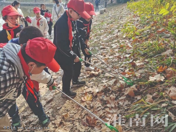 圖二:淮師附小本部校區(qū)少先隊員走進龍湖公園撿拾垃圾。