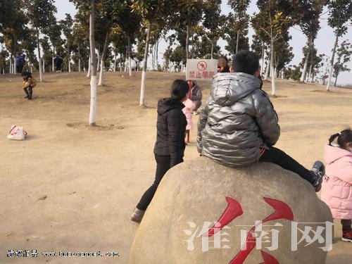 春節(jié)期間,淮河公園涌入大量游客。公園的幾塊大石頭前,已豎起警示牌,上面寫著“禁止攀爬”四個(gè)紅色大字,但總有淘氣的孩子偏要攀爬到石頭上。(記者 攝影報(bào)道)