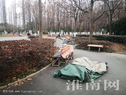 元旦期間,許多游客來到龍湖公園里游玩、健身。在公園健身器材旁的路上,雜亂擺放著許多破舊的架子、油布,影響游人行走。(記者 攝)