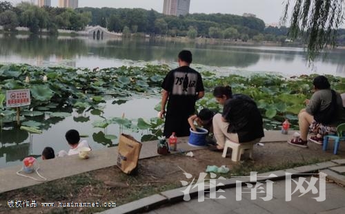 另外,還有許多家長(zhǎng)帶著孩子拿著小水桶在龍湖公園的湖邊玩耍,撈魚蝦和水生植物,甚至,還有的將荷葉摘下戴在頭上。