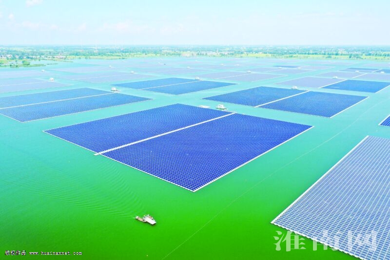 近年來,我市利用采煤沉陷區(qū)水域空間建設(shè)水面漂浮式光伏電站,不僅實現(xiàn)了儲水灌溉、光伏發(fā)電和漁業(yè)養(yǎng)殖的綜合利用,還有效改善了水質(zhì),實現(xiàn)了經(jīng)濟效益、生態(tài)效益、社會效益相統(tǒng)一。圖為鳳臺縣顧橋鎮(zhèn)鳳棲湖“漁光互補”項目俯瞰。(記者 張越 攝)
