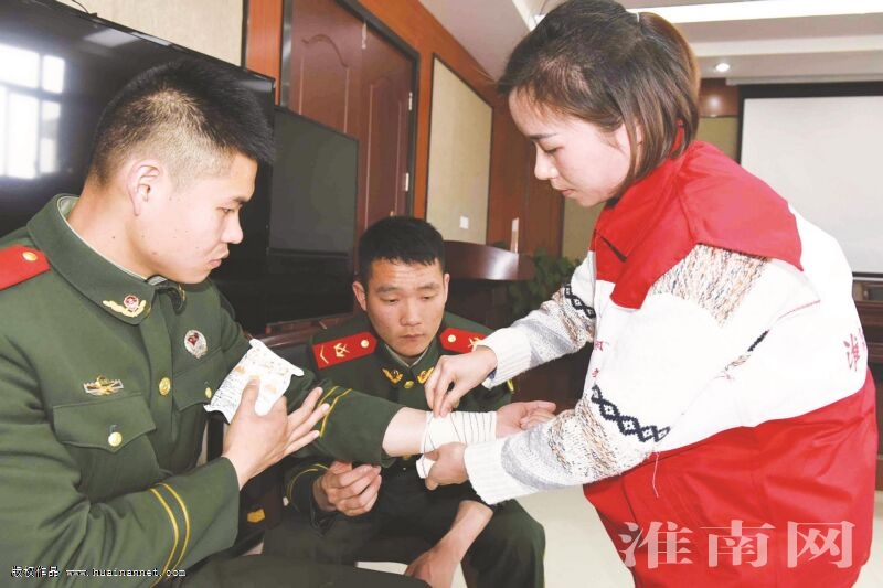 市紅十字會(huì)志愿者楊子(右一)示范外傷急救包扎技術(shù)。(資料圖片)