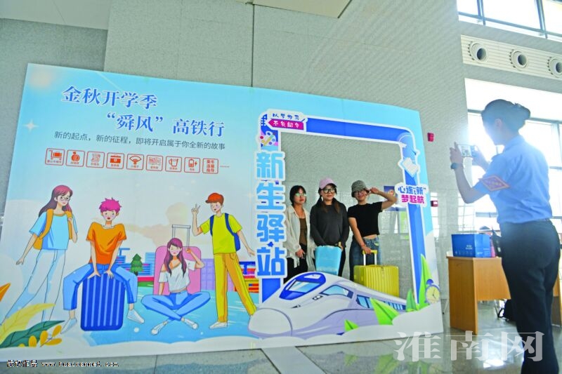 8月29日,淮南南站候車室,大學(xué)生在新生驛站展板前打卡留念。秋季新學(xué)期到來,學(xué)生客流增多,淮南南站在候車室設(shè)置新生驛站,為學(xué)生旅客免費(fèi)提供針線盒、捆綁帶、飲用水、充電等20余項服務(wù),保障學(xué)生旅客順利出行。