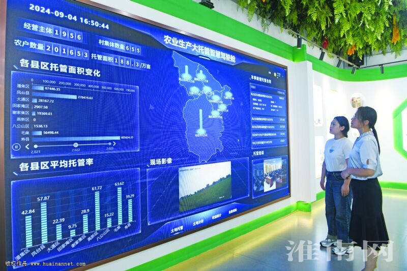 近年來,由安徽農(nóng)管家負(fù)責(zé)運(yùn)營的淮南市農(nóng)業(yè)生產(chǎn)大托管產(chǎn)業(yè)服務(wù)平臺(tái)引入數(shù)字化、區(qū)塊鏈、衛(wèi)星遙感等技術(shù),為托管經(jīng)營主體提供農(nóng)資集采、貸款保險(xiǎn)、農(nóng)服撮合、農(nóng)技培訓(xùn)、烘干倉儲(chǔ)、農(nóng)特產(chǎn)品銷售等一站式服務(wù),現(xiàn)已吸引20多萬農(nóng)戶、655個(gè)村集體、近2000個(gè)經(jīng)營主體入駐農(nóng)業(yè)生產(chǎn)大托管產(chǎn)業(yè)服務(wù)平臺(tái)。2024年,我市水稻托管面積達(dá)188萬畝。圖為9月4日,市農(nóng)業(yè)生產(chǎn)大托管產(chǎn)業(yè)服務(wù)平臺(tái)實(shí)時(shí)更新農(nóng)業(yè)生產(chǎn)托管服務(wù)、托管合同等數(shù)據(jù),通過農(nóng)田數(shù)字管家,服務(wù)現(xiàn)代農(nóng)業(yè)生產(chǎn)。(記者 陳 彬 攝)