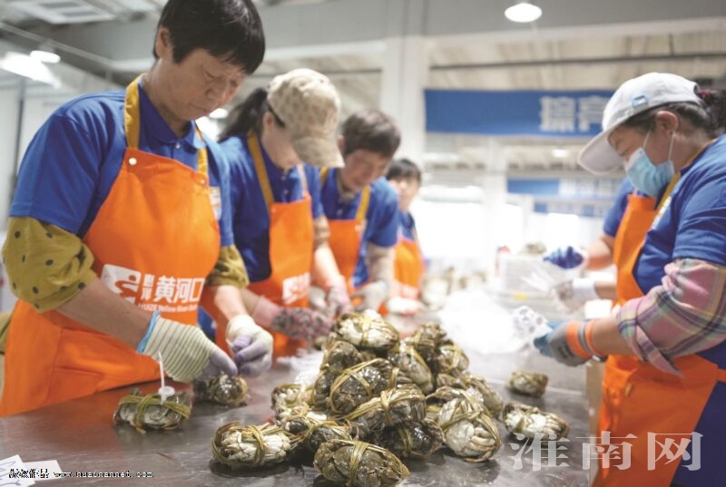 9月10日,山東省東營市墾利區(qū)的一處大閘蟹加工車間的工作人員對新鮮的大閘蟹進(jìn)行分選和捆扎。