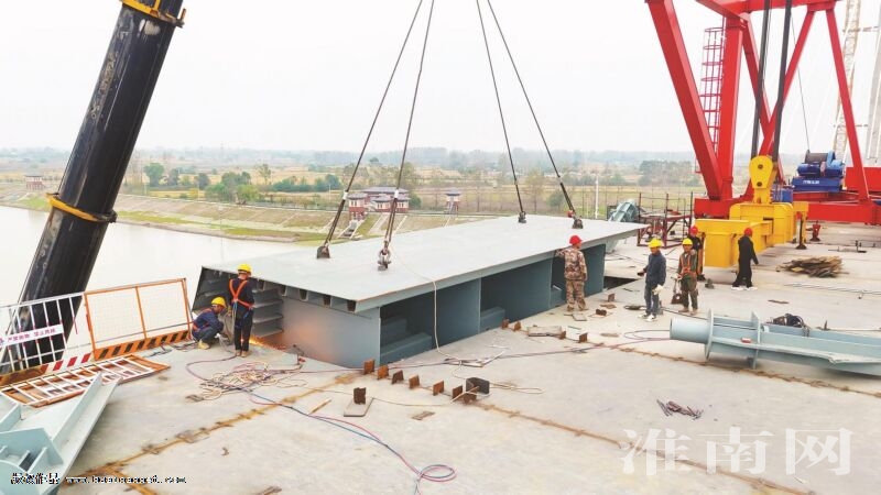 “東淝河特大橋主橋共13節(jié)梁段,鋼箱梁總重約4000噸,采用橋面吊機和支架吊裝結合的方式分段逐節(jié)吊裝!卑不战üぢ窐蚝现芨咚倩茨隙温坊4標項目黨支部書記何濤介紹。由于主橋鋼箱梁節(jié)段構件多,吊裝作業(yè)安全風險較高,為順利完成主橋合龍,項目團隊組織召開多次研討會,推演安裝方案,通過設置現(xiàn)場拼裝平臺,變“高空拼裝”為“地面組裝”,將小節(jié)段鋼箱梁“合體變身”后進行吊裝作業(yè),大大降低高空作業(yè)風險,有效保障了大橋施工質(zhì)量和效率,較合同工期提前近10個月完成主體建設任務。