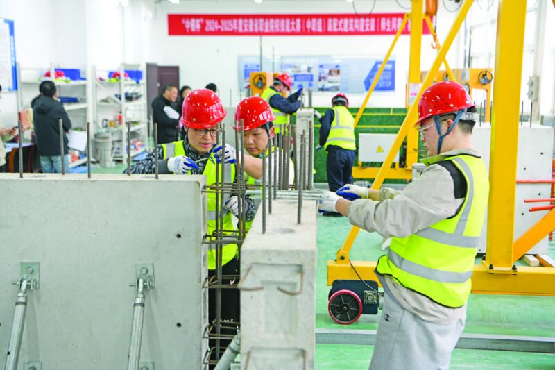 1月11日,2024至2025年度安徽省職業(yè)院校技能大賽(中職組)“水利工程制圖與應(yīng)用、裝配式建筑構(gòu)件安裝、產(chǎn)品數(shù)字化設(shè)計(jì)與開發(fā)”等5個賽項(xiàng)在淮南經(jīng)濟(jì)技術(shù)學(xué)校開賽,來自全省104支代表隊(duì)190名教師和學(xué)生選手同臺競技,集中展示了中職教育教學(xué)成果。圖為參加選手在“裝配式建筑構(gòu)件安裝”賽項(xiàng)中比拼技能。(記者 陳 彬 實(shí)習(xí)生 朱鈺珍 攝)