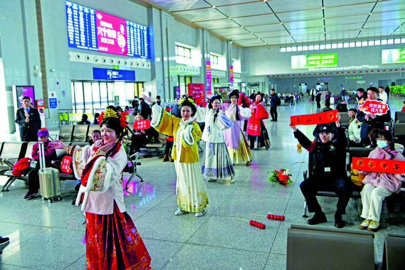 1月14日,淮南南站候車室,鐵路職工表演快閃舞蹈,為旅客送上新春祝福。當日,中國鐵路上海局集團有限公司淮南西站組織管內(nèi)各車站開展“萬福迎春、溫暖旅途”書法公益活動,鐵路職工書寫春聯(lián),表演快閃,為旅客送上新春祝福。當日,2025年春運大幕開啟,從1月14日至2月22日,共計40天。(記者 陳 彬 實習生 朱鈺珍 攝影報道)