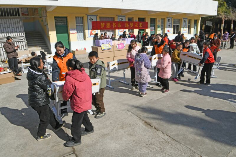 春節(jié)來臨之際,中國鐵路上海局淮南西站組織黨團(tuán)員青年志愿者走進(jìn)市謝家集區(qū)孫廟鄉(xiāng)孫廟小學(xué),開展“愛在陽光下、大手拉小手”關(guān)愛留守兒童志愿服務(wù)活動(dòng)。青年志愿者為部分家庭困難留守兒童贈(zèng)送“夢(mèng)想書桌”,陪伴孩子們體驗(yàn)非遺糖畫、剪紙,書寫春聯(lián)“!弊郑瑸榱羰貎和腿g樂與關(guān)愛。圖為青年志愿者與留守兒童一起搬動(dòng)“夢(mèng)想書桌”。