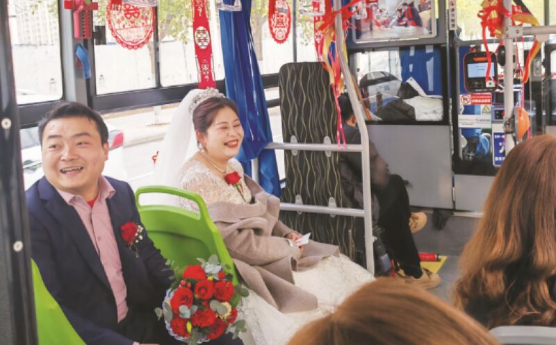 迎親路上,裝飾好的公交婚車從里到外散發(fā)著濃濃的幸福、甜蜜和浪漫氣息。歡快的“喜”字在公交車上跳躍,艷麗的絲帶掛滿車廂,紅色的氣球在公交車上搖擺……裝飾喜慶的公交車?yán),新郎李國慶、新娘王娟與親朋好友一路歡歌笑語,洋溢著滿滿的幸福。