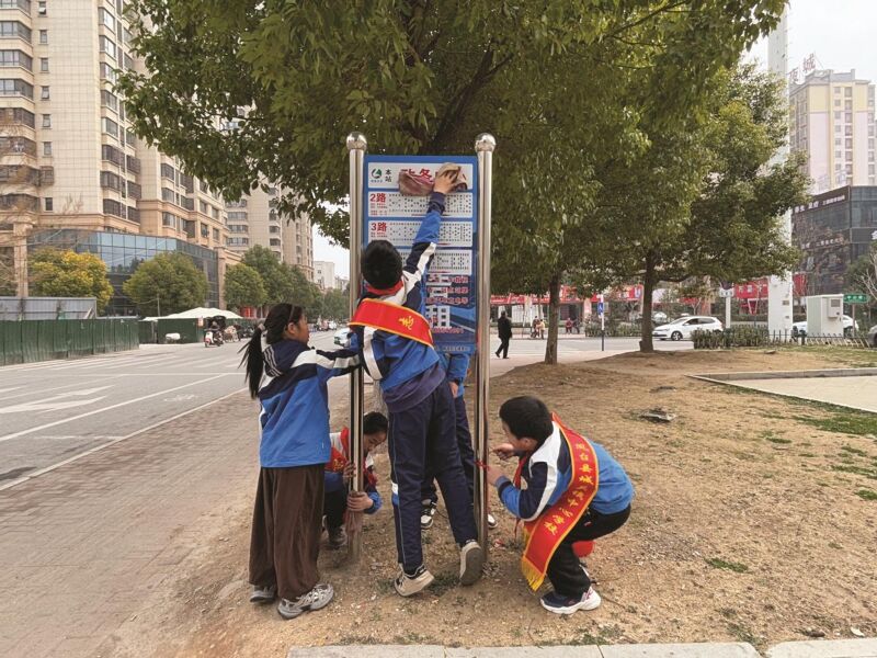 少先隊員擦拭公交站牌
