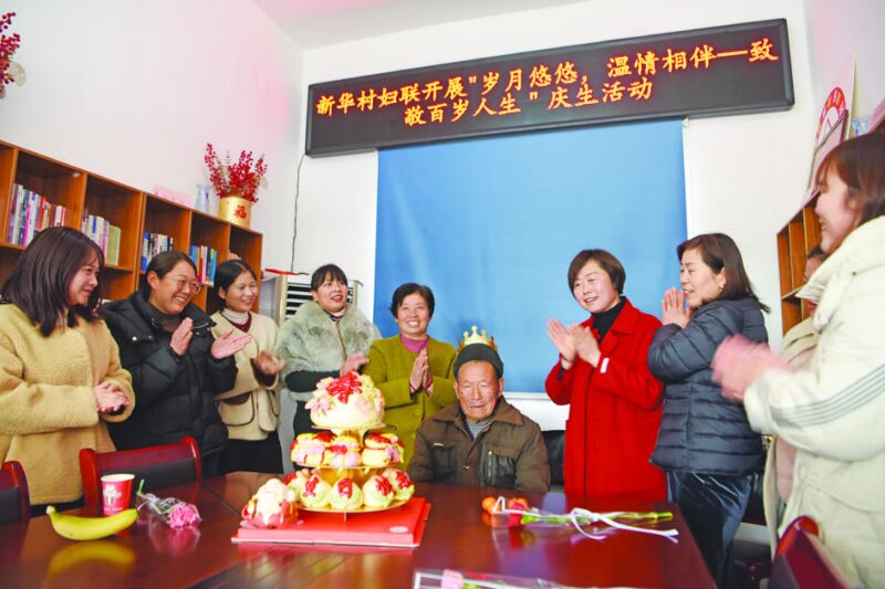 近年來,安徽理工大學駐淮南高新區(qū)三和鎮(zhèn)新華村鄉(xiāng)村振興工作隊與村支“兩委”大力弘揚孝老愛親的傳統(tǒng)美德,積極挖掘群眾身邊的先進典型,用榜樣的力量引領鄉(xiāng)村文明新風尚。圖為近日,三和鎮(zhèn)新華村好媳婦、好婆婆代表共同為村里百歲老人張在良祝壽。