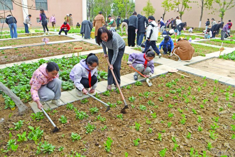 春回大地,淮師附小山南第十五小學(xué)學(xué)生勞動實踐基地開耕。該校在小學(xué)生勞動教育活動中聘請部分家長擔(dān)任勞動輔導(dǎo)員,在校園內(nèi)開辟勞動實踐基地,通過學(xué)生管理校園小菜地,體驗勞動帶來的快樂。圖為淮師附小山南第十五小學(xué)小學(xué)生在校園勞動實踐基地勞作。 (記者 陳 彬 攝)