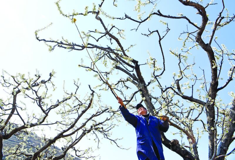 仲春時節(jié),氣溫回升,我市果樹進(jìn)入春管關(guān)鍵期,果農(nóng)搶抓農(nóng)時對果樹進(jìn)行授粉,為增產(chǎn)豐收夯實基礎(chǔ)。圖為3月17日,壽縣八公山鄉(xiāng)郝圩村果農(nóng)給李子樹花授粉。(記者 陳 彬 攝)