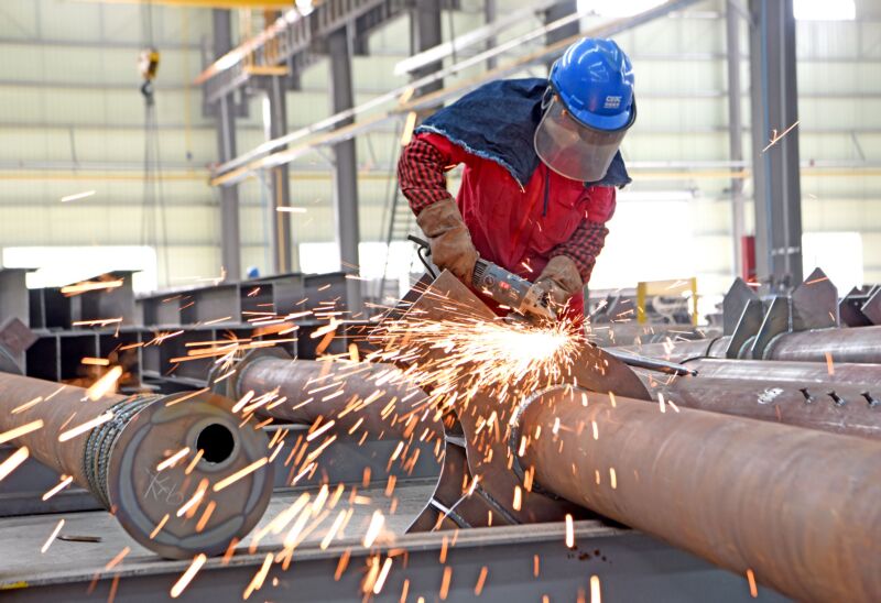 3月24日,大通工業(yè)園內(nèi),中能建建筑集團(tuán)淮南至精鋼結(jié)構(gòu)分公司職工加工鋼結(jié)構(gòu)產(chǎn)品。一季度是全年經(jīng)濟(jì)的風(fēng)向標(biāo),各企業(yè)紛紛開足馬力趕訂單、忙生產(chǎn)。(記者 陳 彬 攝)