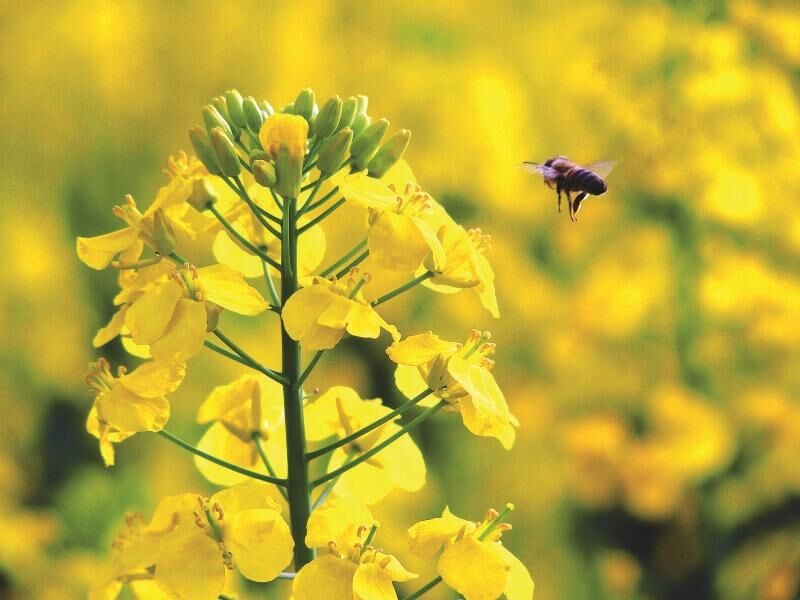 油菜花開,踏青野外,讓人欣喜。微風(fēng)吹拂,油菜花搖曳生姿,淡淡花香沁人心脾。油菜花期較長,細(xì)水長流,只見菜薹上抽出長長的花穗,花朵由下至上次第開放,在底部凋落,乃至結(jié)出莢果時,頂部還在不斷往上生長,依舊開花,花團(tuán)錦簇,燦爛熱烈。由于花粉中含有豐富的花蜜,常引來彩蝶與小蟲子飛舞于花間,由此平添了鄉(xiāng)間田園繽紛的景致。