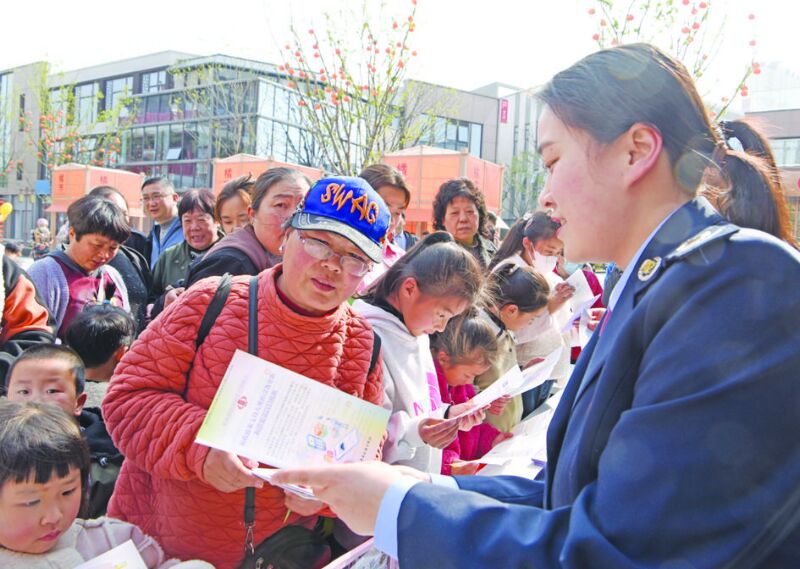 今年4月是第34個(gè)全國(guó)稅收宣傳月,主題是“稅收·法治·公平”,我市稅務(wù)機(jī)關(guān)廣泛開展稅收法治宣傳教育,培養(yǎng)公民樹立依法誠(chéng)信納稅意識(shí)。圖為3月30日,市稅務(wù)局第二稅務(wù)分局工作人員走進(jìn)春申里文旅街區(qū),向市民、經(jīng)營(yíng)戶宣傳稅收政策。(記者 陳 彬 攝)