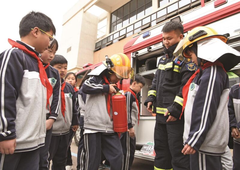 圖一:淮師附小山南第十五小學(xué)學(xué)生在消防救援人員指導(dǎo)下學(xué)習(xí)消防知識。