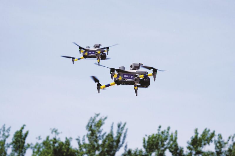 “廣大司乘朋友,你們好,淮南交警提醒您,無人機(jī)正在巡邏,請(qǐng)您文明駕駛,遵守交通法規(guī),切勿占據(jù)應(yīng)急車道,祝您一路平安!”飛行過程中,無人機(jī)打開“話匣子”向過往車輛播報(bào)信息,提醒車輛駕乘人員遵守交通法規(guī)。