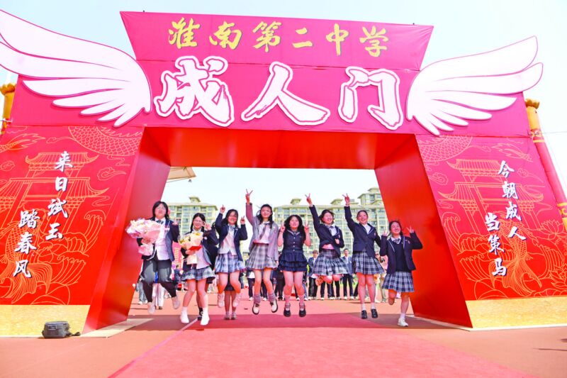 5月4日,淮南二中舉行2025屆高三學(xué)生十八歲成人禮,1600余名學(xué)生通過跨越成人門、十八歲成人宣誓、感恩父母、放飛夢想氣球、寫給二十年后自己的信等形式致敬青春,在青春的征途上不斷前行、探索和成長。圖為5月4日,淮南二中高三學(xué)生走過成人門后歡呼跳躍。