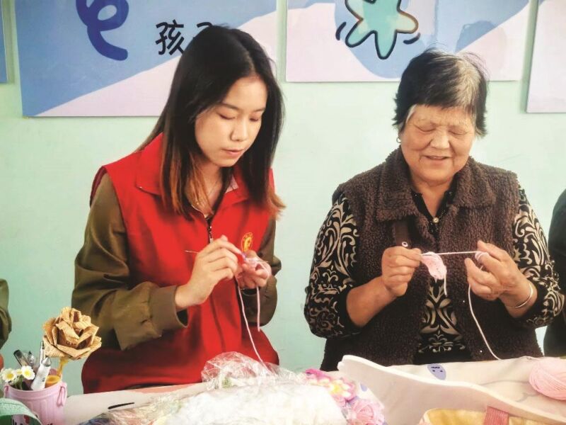 活動現(xiàn)場,來自淮南師范學院心藝手工社的專業(yè)大學生團隊現(xiàn)場指導,采取“一對一”教學模式,耐心細致地為學員們講解毛線鉤織的基礎(chǔ)針法、花樣設(shè)計與成品制作等知識。學員們圍坐在一起,認真聆聽,不時提問,大家相互交流與學習,積極動手實踐。從簡單的杯墊到可愛的玩偶,再到精致的家居裝飾品,在志愿者的指導下,一件件精美的手工作品逐漸成型 。