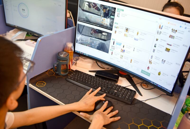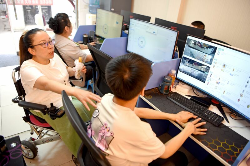 一名殘疾人在助殘就業(yè)中心通過網絡進行自動售賣機后臺審核標注工作。
