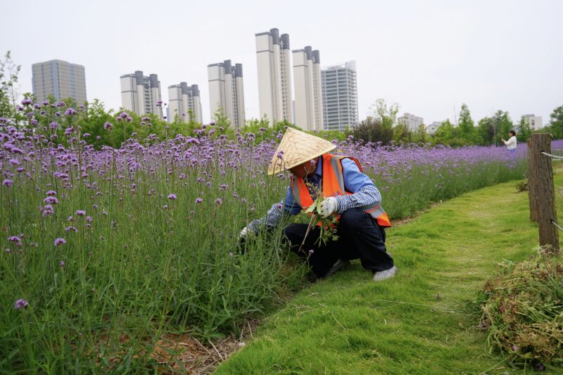 (記者 蘇國義 攝影報(bào)道)5月14日中午,在淮南高新區(qū)E水系帶狀公園紫色網(wǎng)紅花海里,“園丁”盧本義戴著斗笠帽,冒著綿綿細(xì)雨,從花海里拔出一叢又一叢的野草。花海的美,他們在默默守護(hù)!