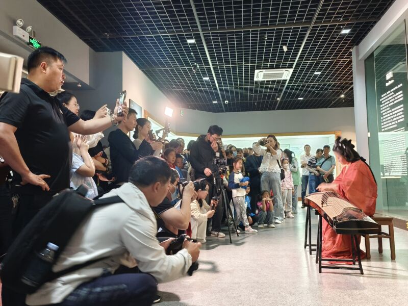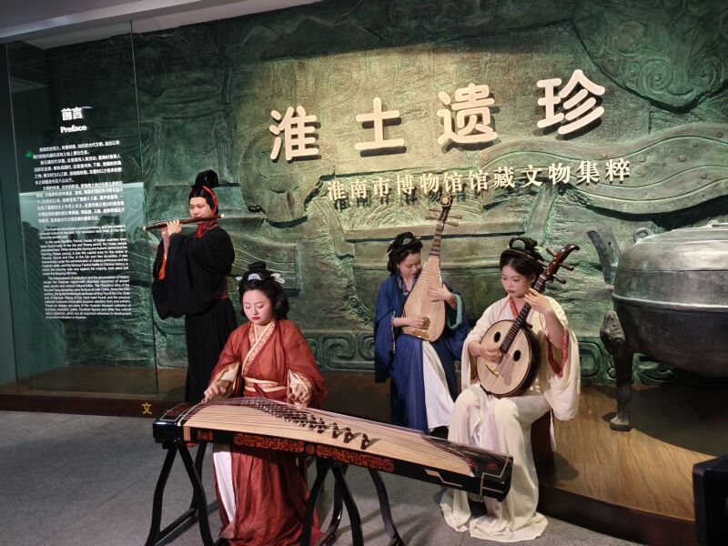 音樂(lè)會(huì)一開(kāi)始,淮南武王墩一號(hào)墓出土的青銅編鐘測(cè)音采集音樂(lè)曲《瑤族舞曲》首次呈現(xiàn),讓沉睡兩千年的禮樂(lè)重獲新生。隨即,身著楚漢服飾的青年演奏家來(lái)到觀眾面前,箏、笛、琵琶、中阮四大傳統(tǒng)樂(lè)器聯(lián)袂登場(chǎng),《將軍令》《十面埋伏》《春到湘江》……演奏家們移步各個(gè)展廳演繹九大經(jīng)典曲目,完整呈現(xiàn)楚漢時(shí)期“鐘鼓琴瑟,笙磬同音”的禮樂(lè)體系,歷史與藝術(shù)在這里完成跨越時(shí)空的共鳴。觀眾們跟隨樂(lè)聲穿行不同展廳,近距離感受中華文明的深厚底蘊(yùn)和時(shí)代表達(dá),沉浸其中、如癡如醉。