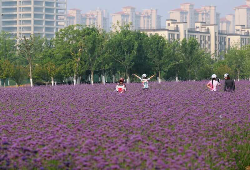 時(shí)值初夏,草木蔥綠,淮南E水系公園的各類觀賞性植物競(jìng)相開(kāi)放,美不勝收。圖為幾位騎友在千畝馬鞭草叢中留影。