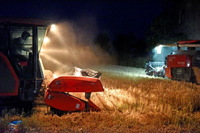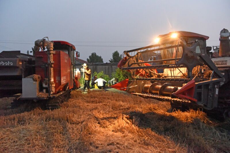 徐懷彪帶著家人在夜幕中搶收小麥,確保周末降雨到來前完成1400畝小麥種糧搶收任務(wù)。