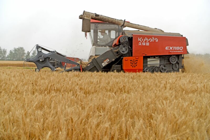 徐懷彪利用收割間隙,為收割機(jī)進(jìn)行養(yǎng)護(hù)。