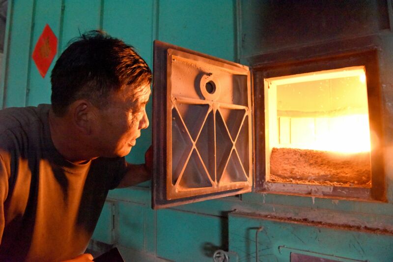 徐懷彪查看小麥烘干機(jī)內(nèi)燃料自動(dòng)投放情況。