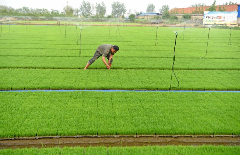 記者看到,倉庫的外側(cè)是面積約20畝的水稻育秧基地,秧苗可以滿足3000畝的水稻種植,其中有1500多畝是周邊村民的?臻e的時(shí)間里,徐甲甲既要查看育秧情況,還要操作植保無人機(jī)播撒農(nóng)藥!懊ν晷←湏屖眨蜏(zhǔn)備水稻插秧了。”