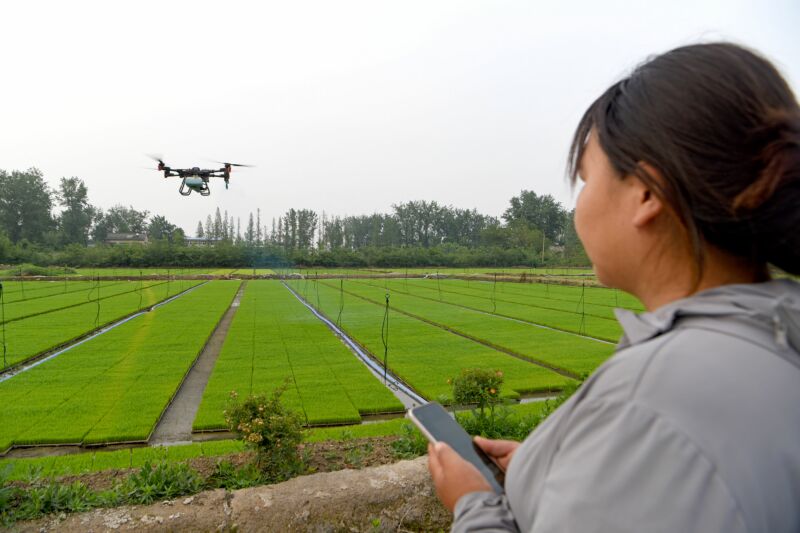 徐甲甲操作植保無人機(jī),為20畝育秧基地秧苗噴藥除蟲。