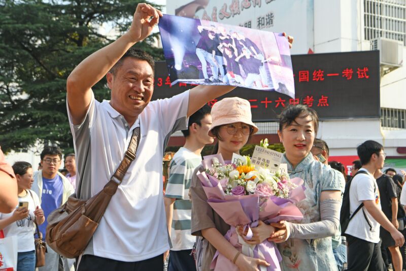 父母迎接考生走出高考考場(chǎng),送上鮮花和偶像畫。