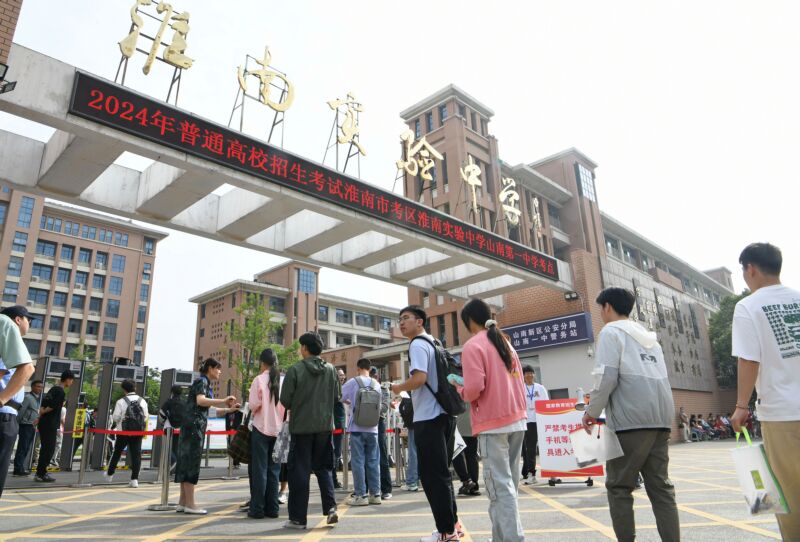考生有序通過(guò)安檢進(jìn)入考場(chǎng)。