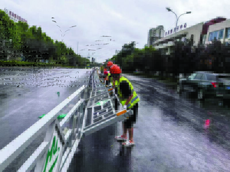 施工人員在G328謝家集區(qū)施工路段將被吹倒的中央隔離護(hù)欄扶正