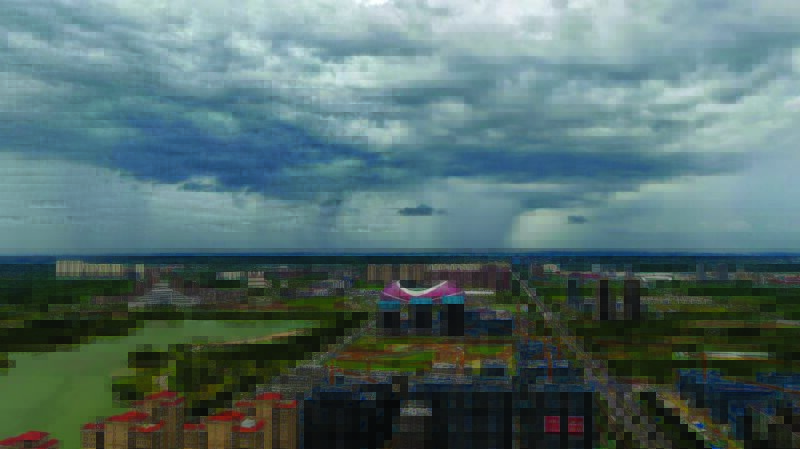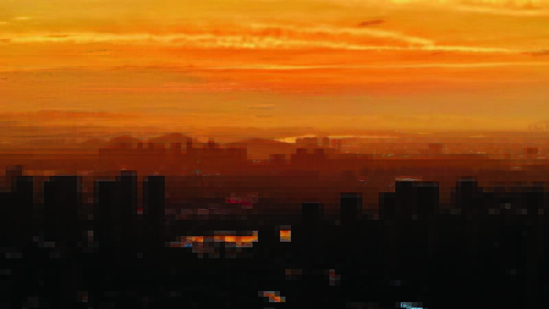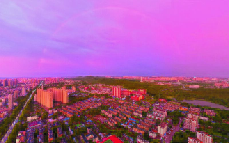6月14日傍晚,一場(chǎng)急雨過(guò)后,城市上空上演自然奇觀。雨云未散,彩虹初現(xiàn),旋即赤金云浪奔涌,將整片蒼穹浸染成流動(dòng)的綢緞。