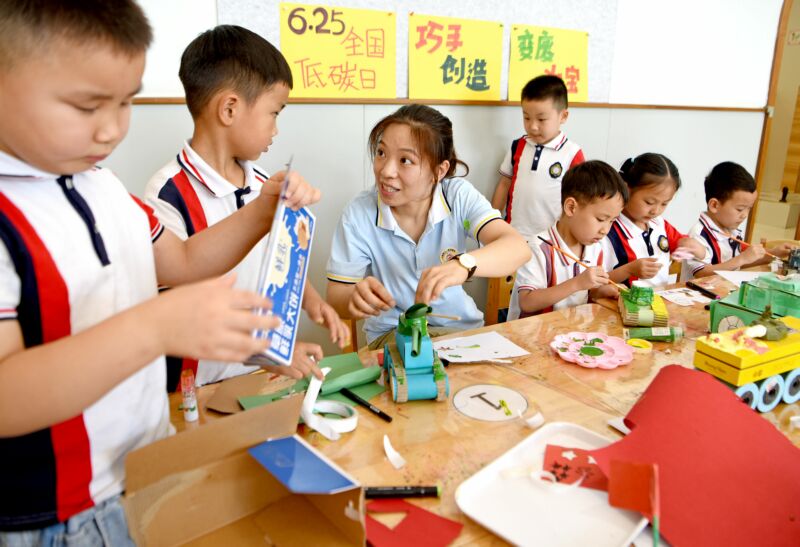 6月25日是2025年“全國低碳日”,今年的主題是“碳路先鋒、綠動(dòng)未來”。我市各地開展內(nèi)容豐富的低碳宣傳活動(dòng),動(dòng)員全社會廣泛參與,促進(jìn)綠色低碳發(fā)展,推動(dòng)形成綠色生產(chǎn)生活方式。圖為市直幼教育集團(tuán)萬茂分園的小朋友利用廢舊紙盒制作手工玩具。