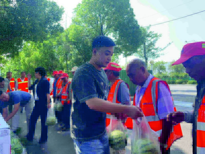 活動現(xiàn)場,50箱礦泉水整齊排列,300斤西瓜新鮮飽滿,每一份物資都飽含著對環(huán)衛(wèi)工人的關(guān)愛。志愿者們親手將礦泉水、西瓜遞到環(huán)衛(wèi)工人手中,與他們親切攀談,由衷感謝他們?yōu)槌鞘协h(huán)境建設(shè)付出的努力,同時反復(fù)叮囑其在高溫天氣下務(wù)必做好防暑降溫措施,注意身體健康。