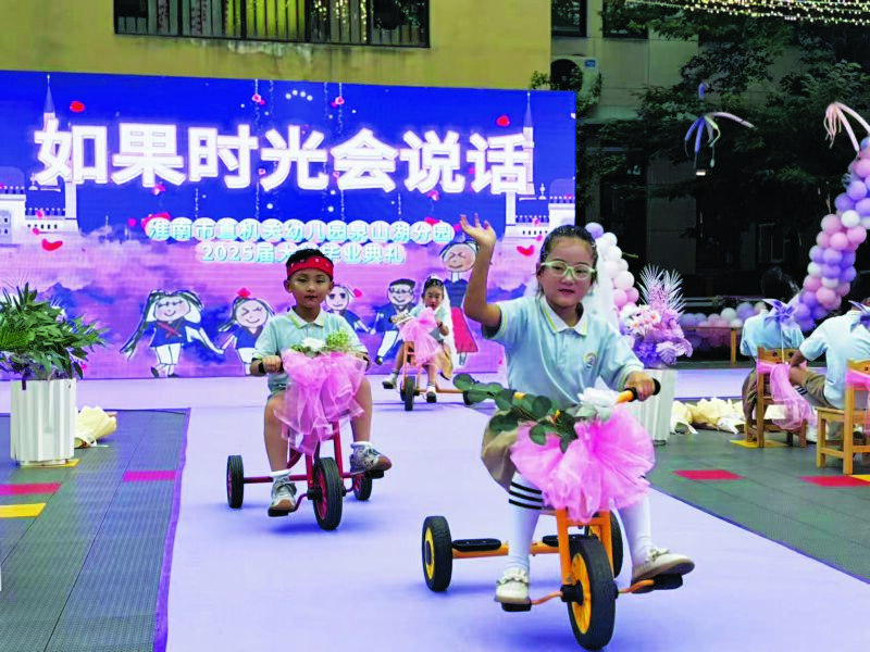 活動(dòng)分為“成長(zhǎng)之門(mén)·邁向未來(lái)的星光”“星芒璀璨·童聲里的告白”“星光躍動(dòng)·踮起童年的綺夢(mèng)”三個(gè)篇章。孩子們跨上色彩繽紛的小花車(chē),踩著踏板駛向那象征希望的成長(zhǎng)門(mén)。隨后,精彩的文藝匯演拉開(kāi)帷幕。打擊樂(lè)《天天向上》、手勢(shì)舞《向陽(yáng)花》、舞蹈《讓愛(ài)傳出去》、情景劇《下一個(gè)路口見(jiàn)》……大班的孩子們用一個(gè)個(gè)精彩的表演,來(lái)抒發(fā)內(nèi)心對(duì)這段幼兒園時(shí)光的珍惜與不舍,同時(shí)也展現(xiàn)出他們那如陽(yáng)光般燦爛的活力與熱情。